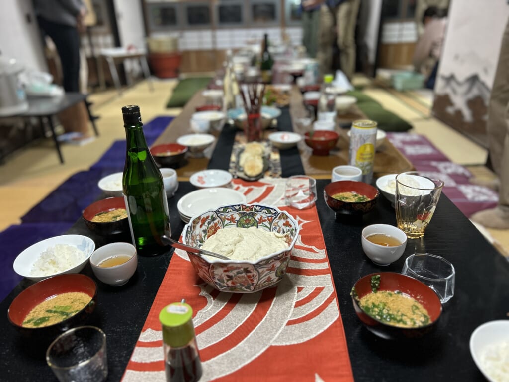 夜は、山口市徳地地域で開催されていたワーケーションプログラムを訪ね、まるで親戚の集まりのようなアットホームな雰囲気の中で交流会を開催。地域で作り続けられているモクズガニのお汁やほっかほかの釜炊きご飯、徳地地域で150年以上の歴史を持つ伝統野菜「やまのいも」などを酒の肴に、本プログラムで関わらせていただいた「益次郎ワイン」をいただき、何とも言えない多幸感に浸った夜となりました。