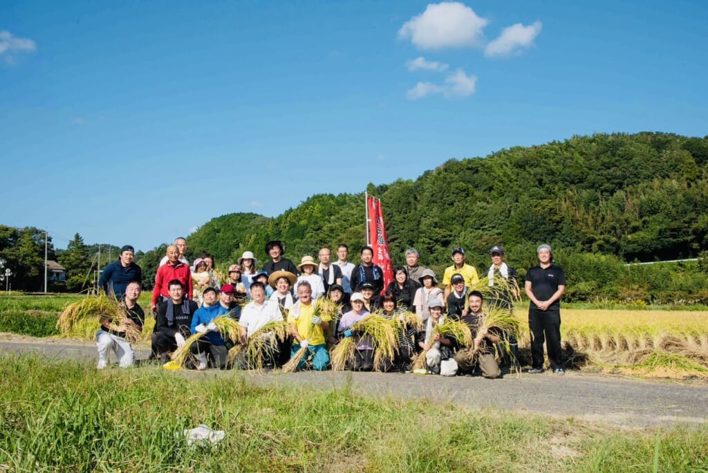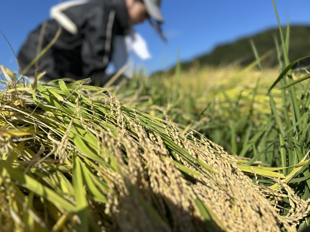 サイクリング後は、「八千代酒造」さんの酒蔵見学&試飲。明治20年創業、萩市内で最も歴史のある酒蔵で、現在は5代目の蒲久美子さんが萩市唯一の女性杜氏として伝統を守りながら、新たな感性を取り入れた酒づくりを展開されています。昼食は、地元のお母さんたちが安全・安心にこだわって手づくりで料理を提供している農家レストラン「むつみ・キッチンばぁ〜ば」で、地元食材をふんだんに使用した、むつみ豚のロースとんかつ定食をいただきました。お腹も満たされた後は、萩・阿武6蔵の皆さんや「Thanks Buddy」の皆さん、地域の方と一緒に酒米の稲刈りを体験しました。初めての稲刈り、また季節外れの暑さに苦戦しながらの作業となりましたが、それぞれに没頭し、あっという間に終了の時間となりました。【日本酒】というキーワードでこんなにもたくさんの方々とつながることができる、改めてその魅力の大きさに気付かされたプログラムとなり、次回以降、どんな体験が待っているのか、わくわくを胸に帰路につきました。