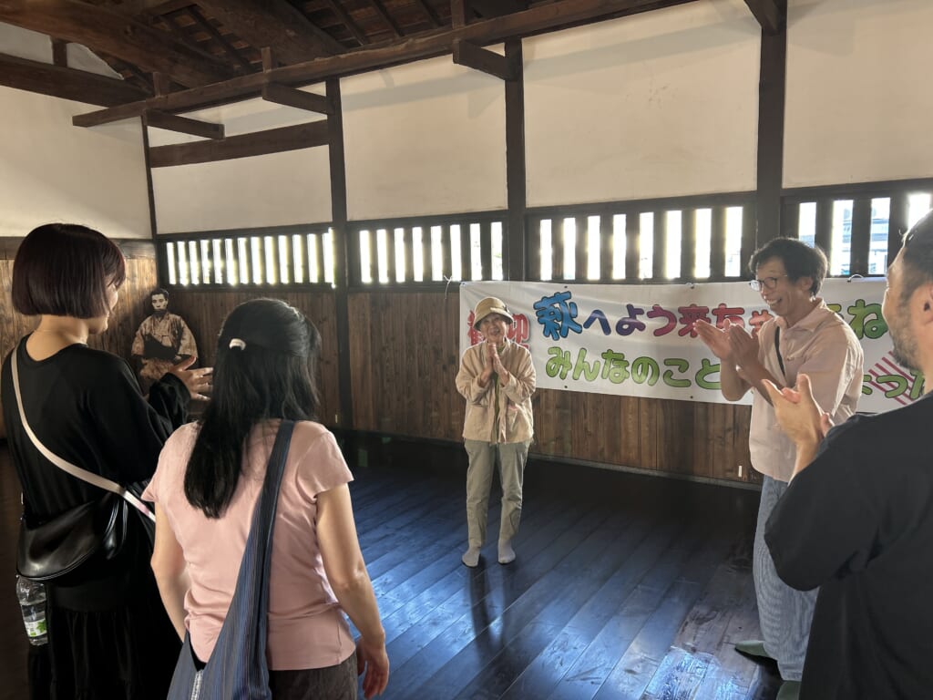 旧明倫小学校の木造校舎(国登録有形文化財)をリノベーションした観光・文化施設「萩・明倫学舎」の敷地内にあるバスセンターに集合し、そのままオリエンテーションを兼ねた入村式(ウェルカムセレモニー)へ。今回の滞在では、民泊に宿泊いただくことから、受け入れをしてくださるホストファミリーの野原さんとの対面を、槍・剣道場として使用されていた「有備館」で行いました。書道や竹刀を用いたレクリエーションなど、お互いにゆっくりと緊張がほぐれていく、温かな入村式となりました。
