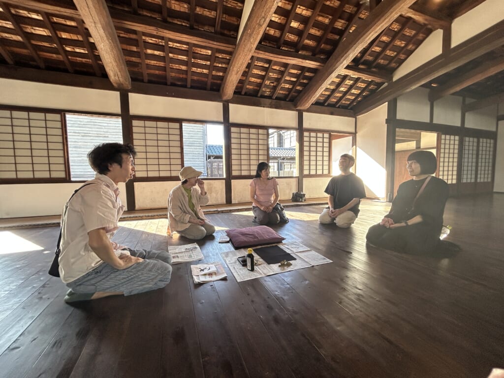 その後は、インバウンド向けの酒蔵見学ツアーや地域の資源(未利用、捨てられてしまうもの)を活用した企画を展開している、秋山さんが営む民泊「鶴島邸」を訪れました。広島出身の秋山さん、1年間の世界一周を経て帰国し、北海道から本州をと次に住む場所を探していたとき、ふと訪れた萩市で市内を見渡せる「陶芸の村公園」からの眺めを見た時に、ここに住みたいと移住のスイッチが入ったそう。「日本らしい、自然豊か、小さいスケール」という秋山さんの思い描く場所に萩市が合致したというお話や特産である夏みかんやヒノキを活用した香りを軸とした商品開発など、目をキラキラさせてご自身のことや萩のことを語る秋山さんに、参加者の皆さんからも多くの質問が飛び交っていました。