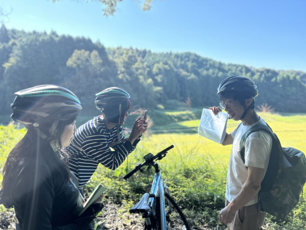 雲ひとつない、すっきりとした秋晴れ。この日は、萩に移住され、さまざまな体験プログラムを造成・提供されている、はぎまえ698合同会社代表の宮崎隆秀さんと一緒に巡る、「FURUSATOサイクリング【日本酒づくりのすべてを巡るサステナブルコース】」からスタート。原料となる酒米を育てる田んぼや豊かな湧き水のほか、全国的にも珍しい取り組みとして注目される「とう精工場(酒米を磨く施設)」など、萩の酒づくりのすべてが循環する地域をE-bikeで巡りました。道中、宮崎さんからのクイズや試食など、五感をフルに使って萩の酒づくり、その現場を感じることができました。猫ちゃんだらけのネコ寺として知られる「雲林寺」さんにも立ち寄り、ネコに特化した色々な商品やグッズ等に参加者も驚いていました。