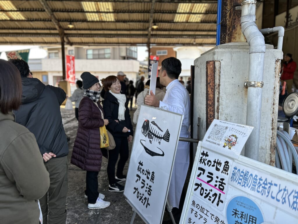 少しだけゆっくりと始まった2日目の朝は、江戸時代の港町の風情が今も残る、年に1回開催される「HAGI・浜崎朝市」で朝食をいただきました。東京のフレンチレストランシェフがつくるフィッシュカレーに長州どりの赤ワイン煮込み、フグ入り味噌汁に練りものなど、萩が誇る食の魅力を贅沢に味わいました。