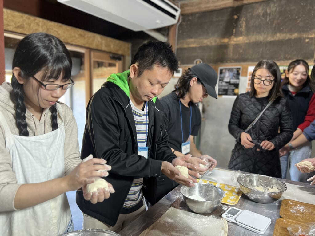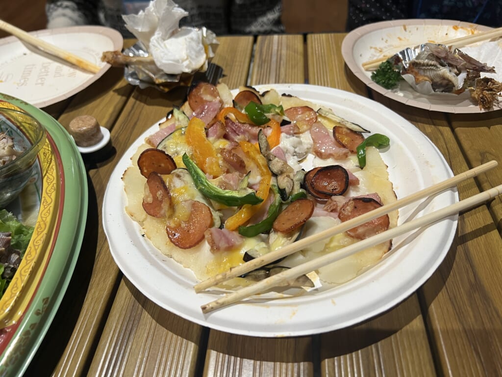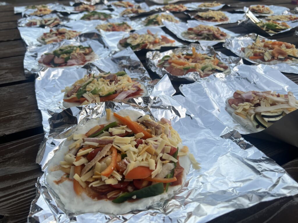 続いて、美祢市でパン屋を営む「練粉屋」の山口さんを講師に、ピザづくりを体験。それぞれが好みの具材を自由にのせ、個性あふれるピザが次々と焼き上がりました。完成したピザをいただきながら親睦会を行い、交流を深めました。